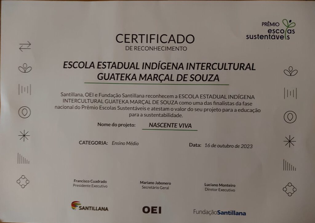 O professor Cajetano Vera da Escola Municipal Indígena Tengatuí Marangatu da aldeia Jagupirú Bororó que desde o início está ativamente no projeto Nascente Viva, recebeu no dia 27.09.21 pelo destaque em diversos projetos em defesa do meio-ambiente o Prêmio Coração Verde. O prêmio foi cedido pela Câmara Municipal de Dourados.