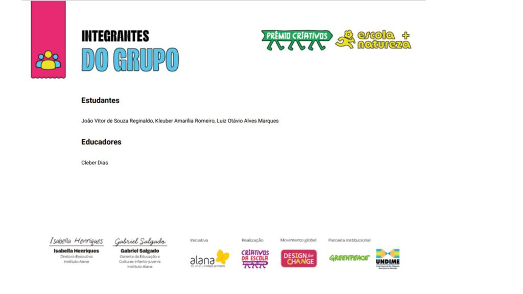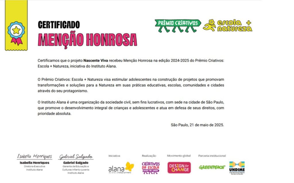 The Nascente Viva project received an Honorable Mention in the 2024–2025 edition of the Creatives: School + Nature Award, an initiative of the Alana Institute.